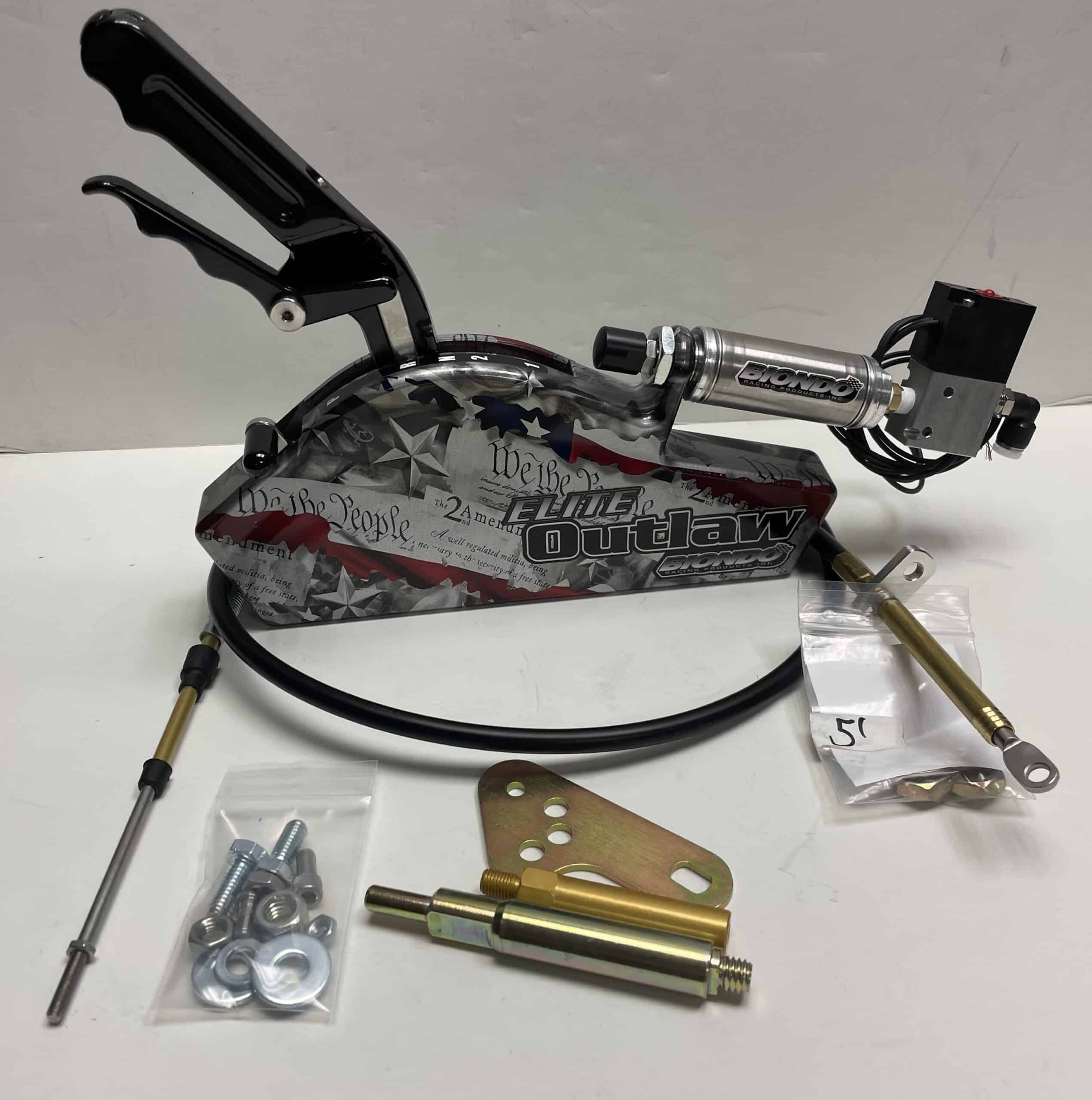 - Elite Outlaw Shifter comes 100% RACE READY with electric or co2 shifting, 5, or 9′ cable, shift arm, and hardware.***This shifter comes with everything needed to mount the cable to the mid-plate, BUT if you want to mount the cable from the rear of the trans, and to the trans pan, please add the ELITE OUTLAW Trans bracket to the order upon checkout, or you can order it below.***